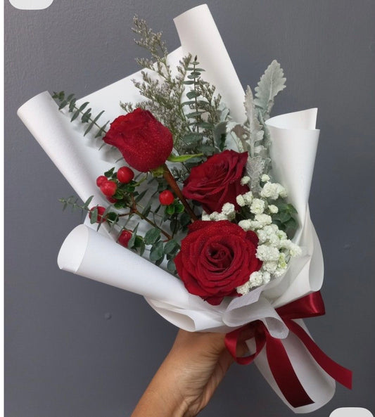 3 beautiful red roses with foilage, gypsopilia and hypericum - gift wrapped & bow to...