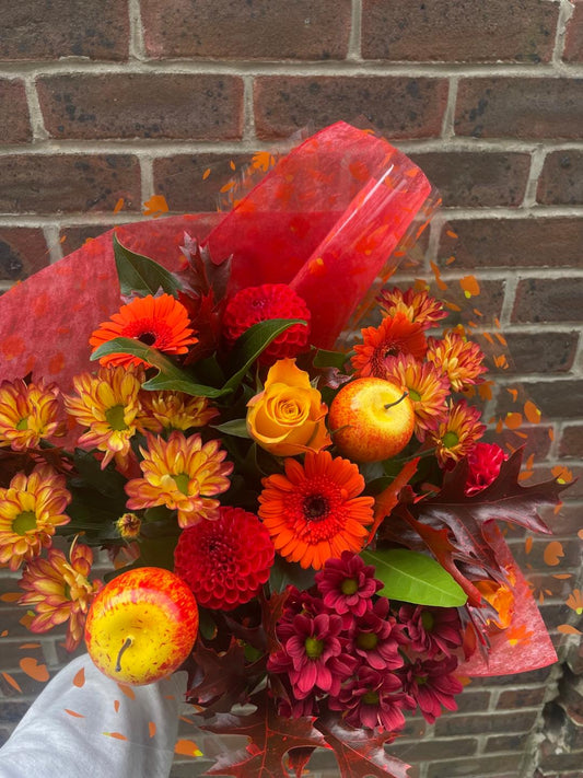 An autumn hand tied of orange lilies, lime green chrysanthemum blooms,orange carnations , hypericum, etc....