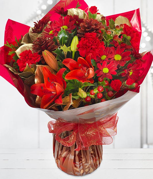 A gorgeous Aqua packed Christmas gift.Full of red carnations, chrysanthemum. Lilies , berries , foliage’s...