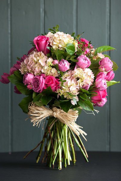 A gorgeous hand tied bouquet of stunning hydrangea,roses, lisanthus and foliage's. wrapped in brown paper...