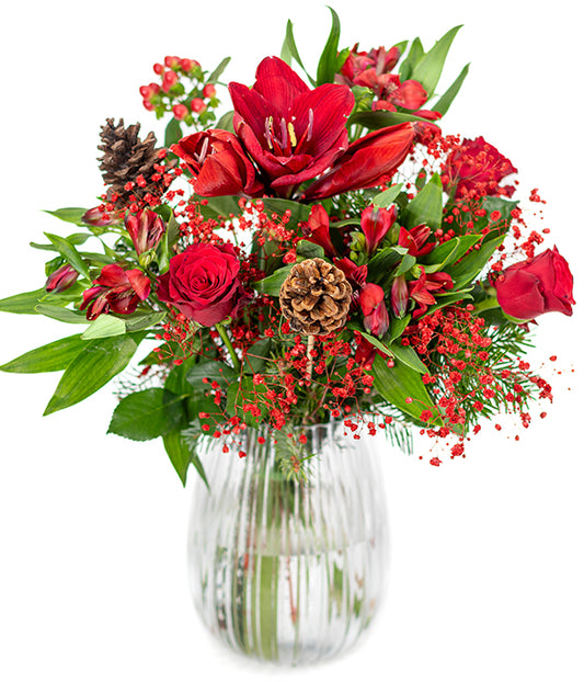 A festive hand tied which is very delicate. The bouquet includes an amaryllis, red roses,...