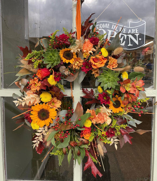 A rustic autumn themed wreath perfect to decorate your door for this season