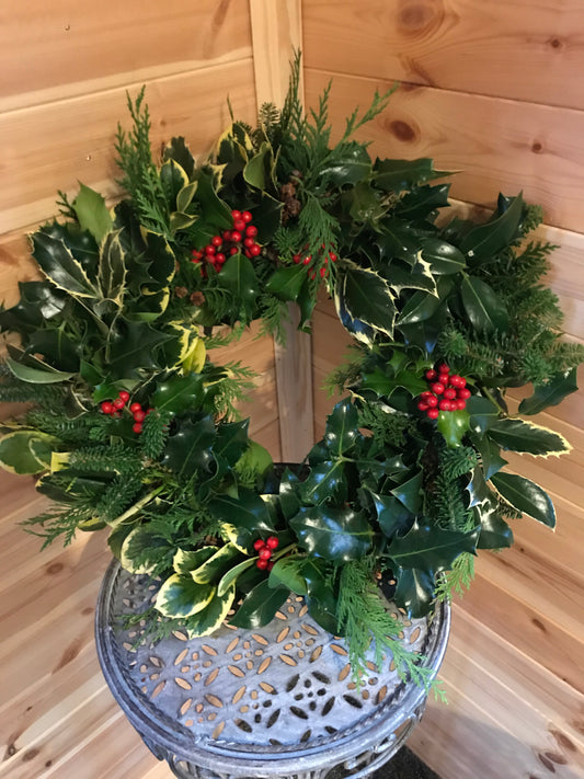 Our holly wreaths are all hand made by us using traditional holly and pines.