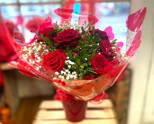 Six beautiful red roses hand tied with foilage and gypsopilia gift wrapped and finished with...