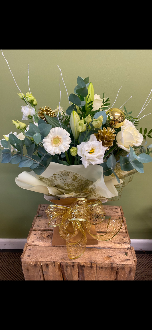A beautiful white candle arrangement with a dash of silver includes roses, carnations & pines...