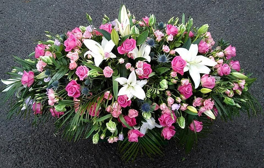 A beautiful coffin spray of pink roses,spray pink roses,white lilies,pink lizzianthus and blue eringium ...
