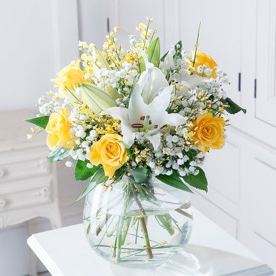A summery handtied in a glass fish bowl, the perfect arrangement for all occasions!