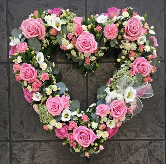A beautiful open heart full of lovely pink roses,carnations,spray roses,white lizzianthus,white stallion , eycalptus ,etc....