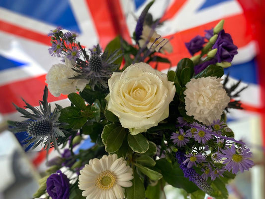 A stunning handtied filled with the colours for this years platinum jubilee. Product may vary...