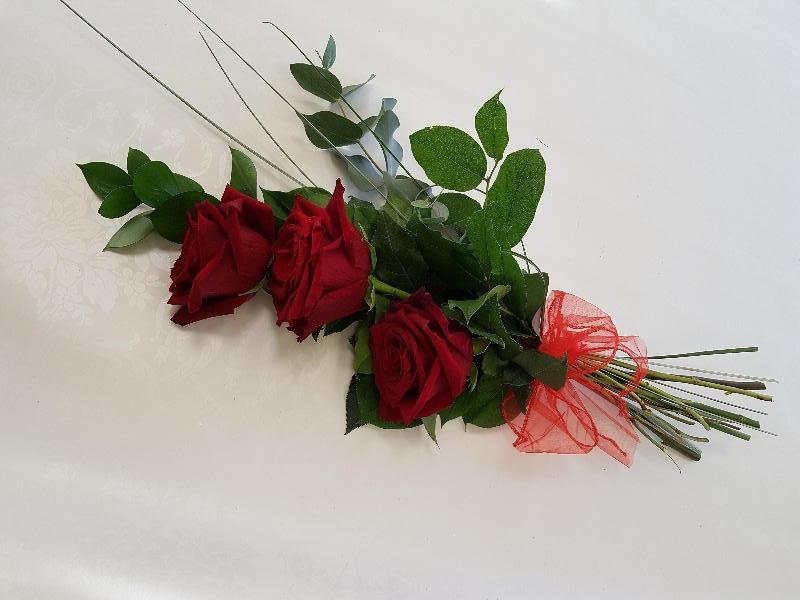 3 beautiful red roses tied with foliage and a red ribbon bow.