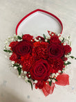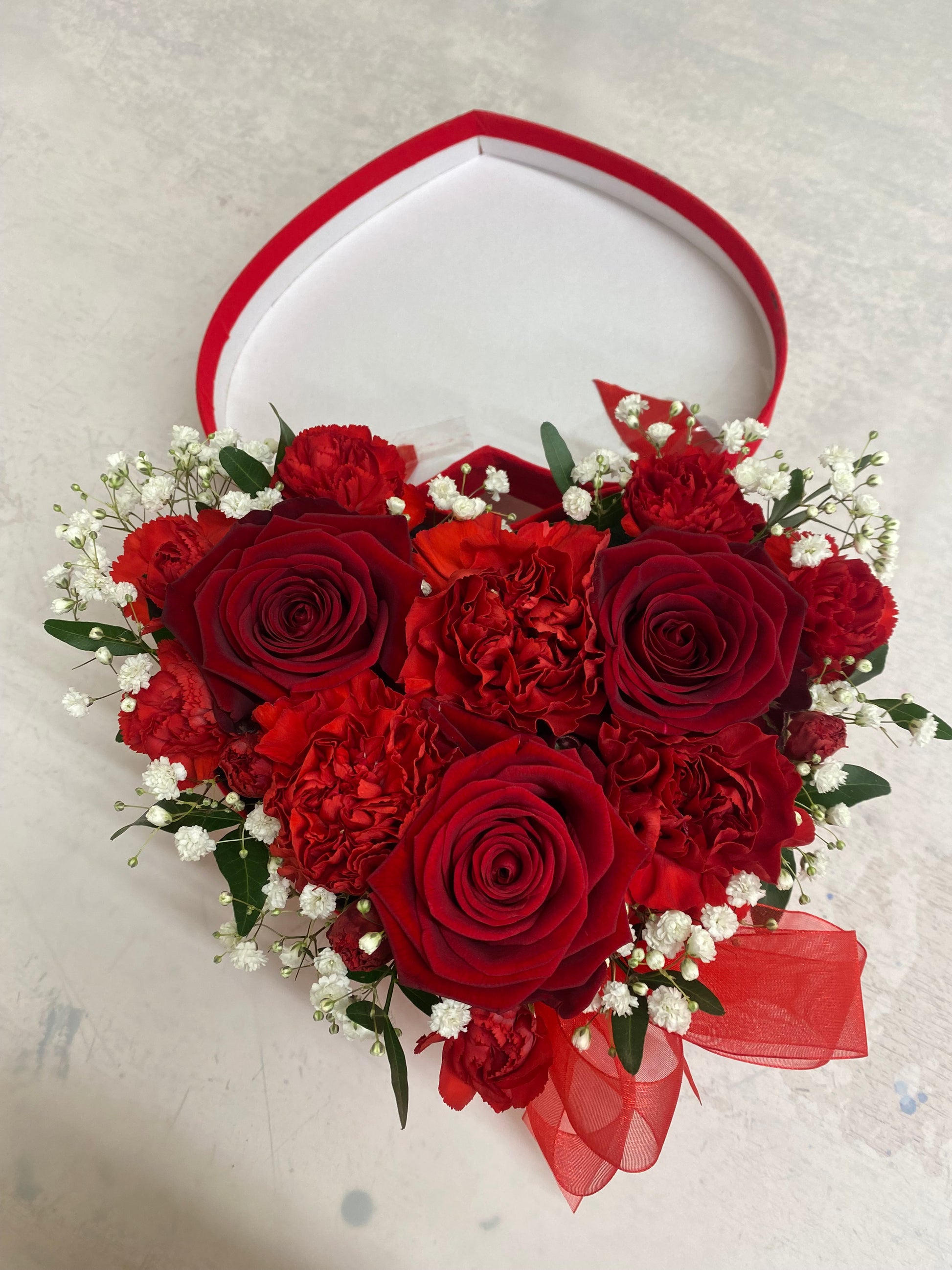 A beautiful velvet heart full of red roses, carnations and gypsopilia.