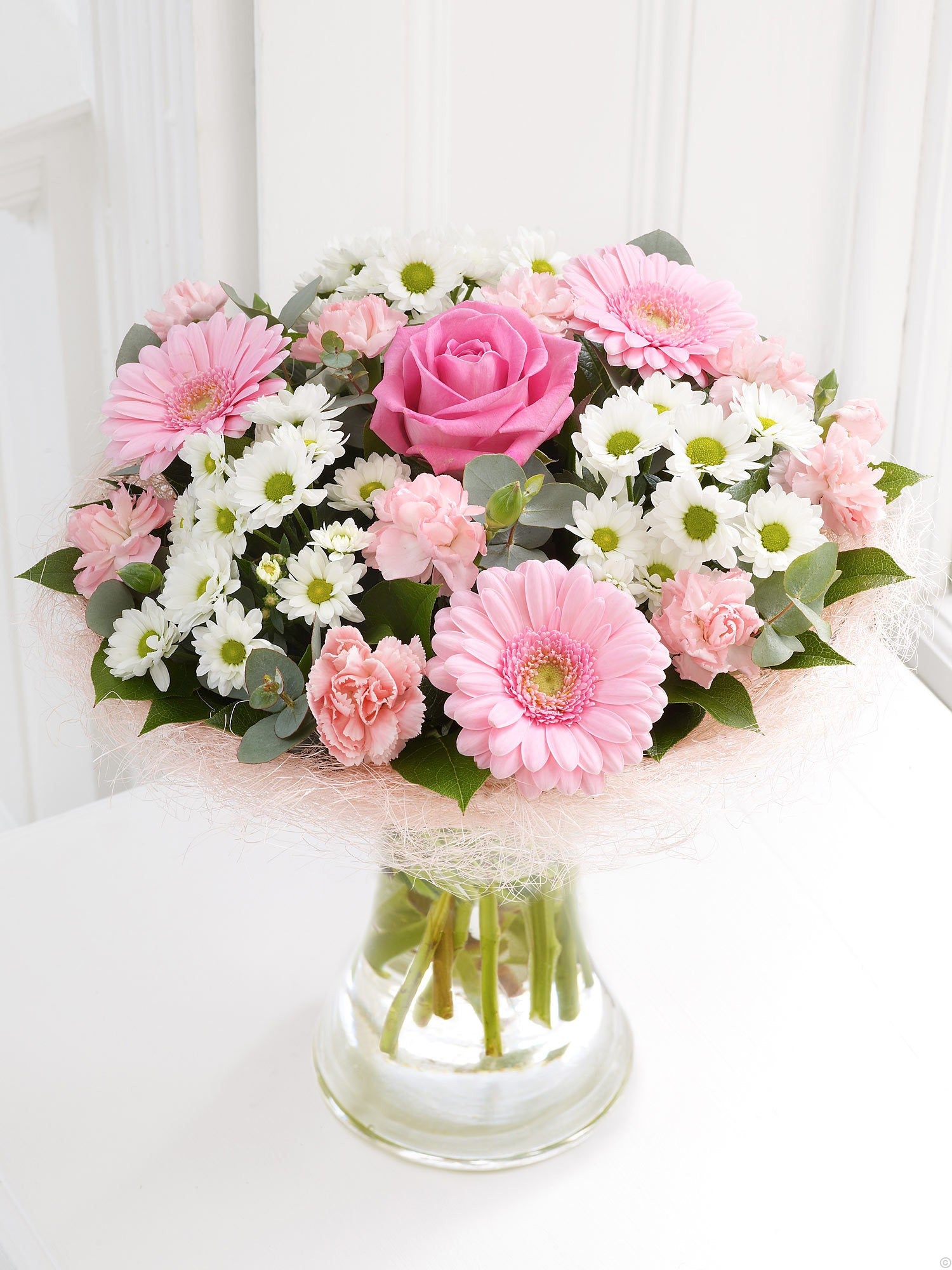 A lovely pink and white hand tied Gift wrapped for delivery.