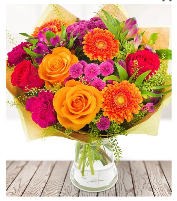 A bright summer hand tied in oranges and cerise’s.including roses, gerbera and chrysanth.
