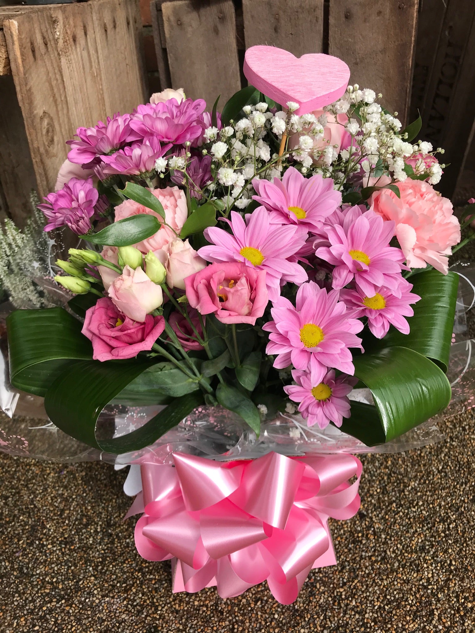 A Beautiful pink aqua packed bouquet. Full of carnations,Lizzianthus,gypsophilia,chrysanthemums, a pink rose and foilages.