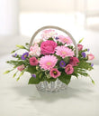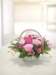 a pretty basket arrangement of germini, carnations , lizzianthus and september flower. A lovely gift for a lovely person.