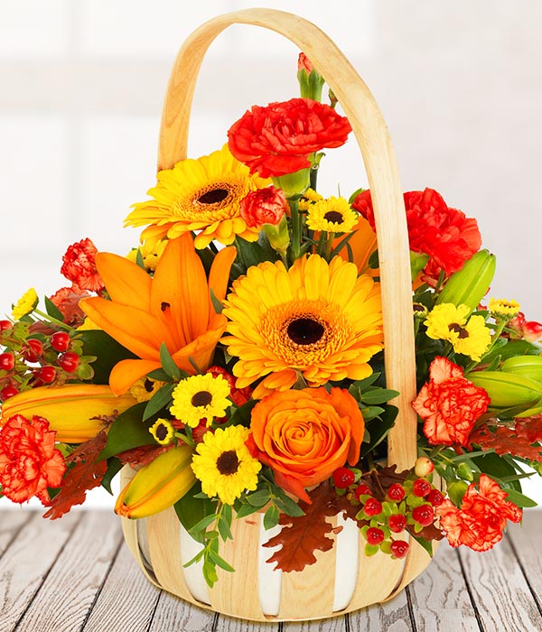 A very autumnal basket of gerbera, roses, santini, lily and carnations.