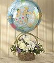 A basket of white and blue flowers arranged for the new baby with a balloon attached.A lovely gift to celebrate the safe arrival.