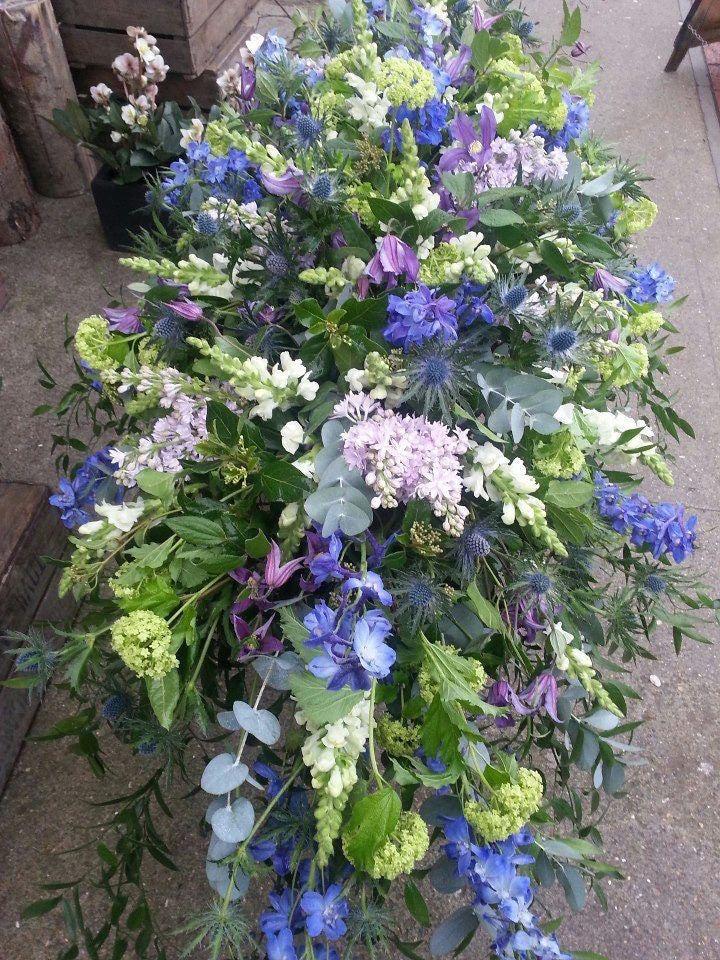 A beautiful coffin spray in shades of blue and lilac. Including country style flowers- delphiniums, eryngium, clematis, stocks , eucalyptus, etc . This one illustrated is 5ft .