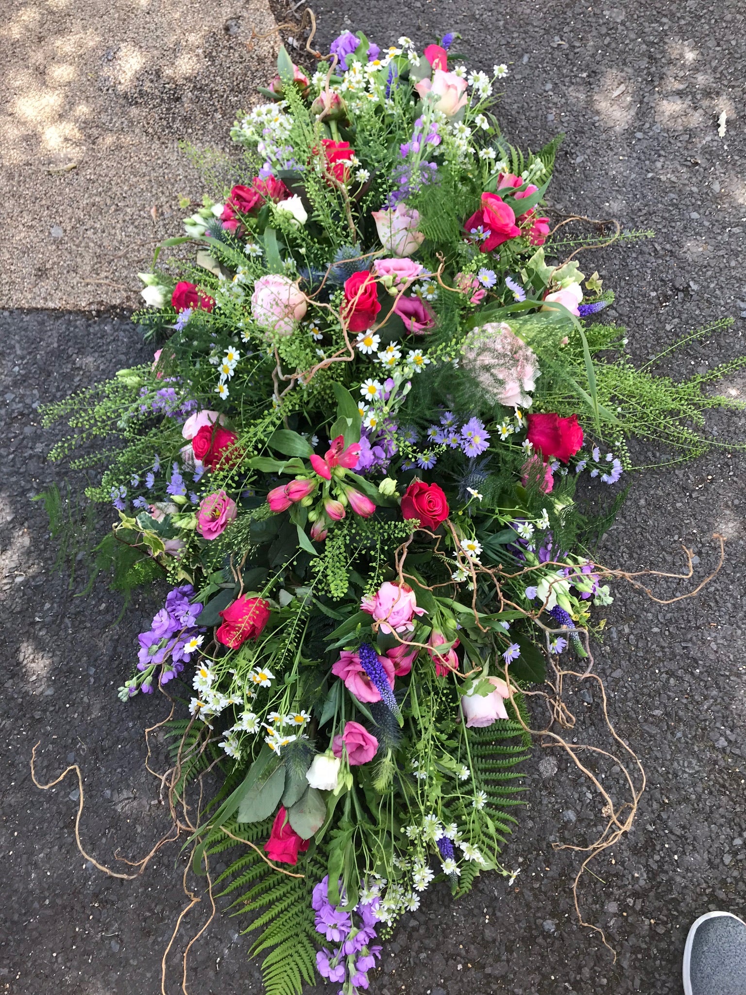 A gorgeous natural coffin spray of ferns, twisted willow, lilac and cerise roses, veronica and blue September flower, alstroemeria,peonies, stocks, thelespi,etc.