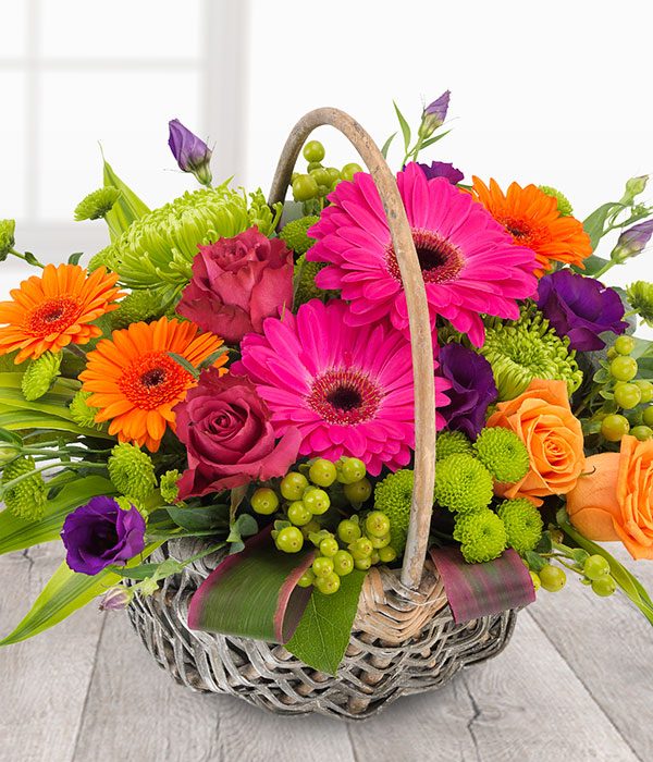 A vibrant basket arrangement which includes gerbera, roses, lizzianthus, chrysanth, blooms and foilages