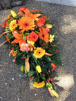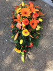 A gorgeous and bright funeral spray in orange and yellow, with lilies and gerbera.