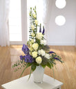 A cool blue and white arrangement that would be perfect for the birth of a baby boy