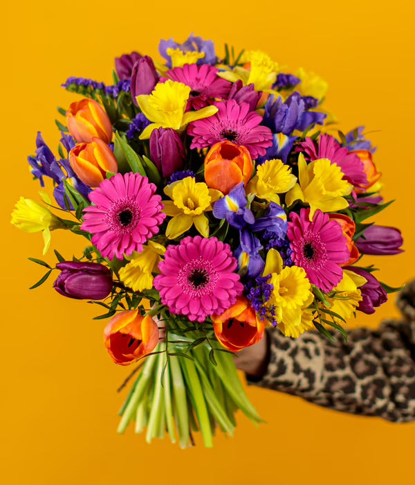 A stunning spring hand tied of iris, tulips , daffodils with bright cerise germini & foilage.