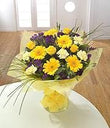 This bright happy Aqua Pack is made of yellow roses, gerbera and carnations mingled with purple lizzianthus and statice for a bold effect.